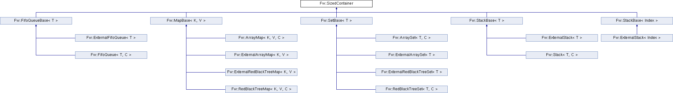 Fw::FifoQueueBase< T > Fw::MapBase< K, V > Fw::SetBase< T > Fw::StackBase< T > Fw::StackBase< Index > Fw::ExternalFifoQueue< T > Fw::FifoQueue< T, C > Fw::ArrayMap< K, V, C > Fw::ExternalArrayMap< K, V > Fw::ExternalRedBlackTreeMap< K, V > Fw::RedBlackTreeMap< K, V, C > Fw::ArraySet< T, C > Fw::ExternalArraySet< T > Fw::ExternalRedBlackTreeSet< T > Fw::RedBlackTreeSet< T, C > Fw::ExternalStack< T > Fw::Stack< T, C > Fw::ExternalStack< Index >