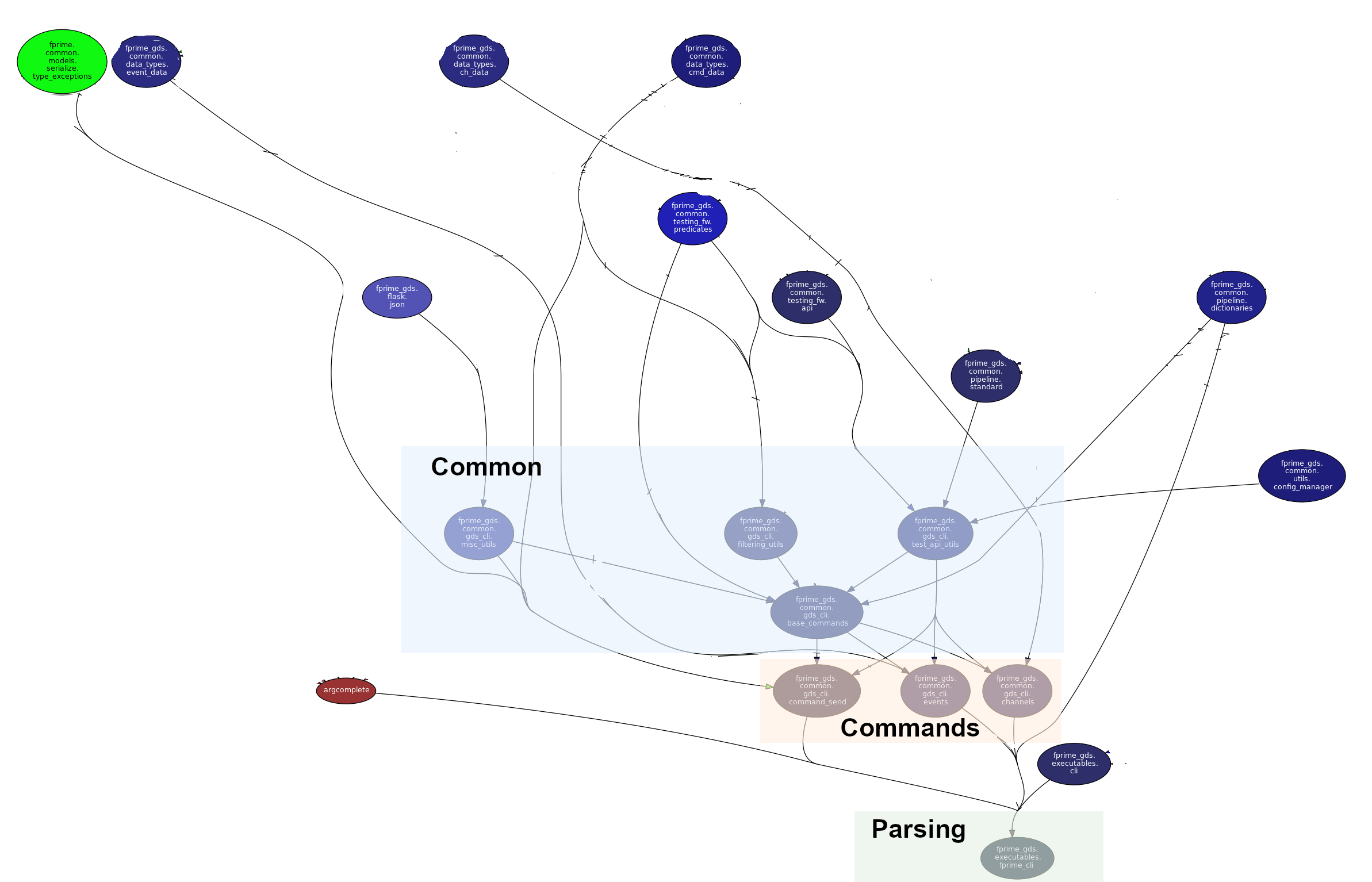 fprime_cli, which imports the command modules and several external libraries to help with parsing. - Each command is implemented separately, but shares a large portion of its code with other modules via the
