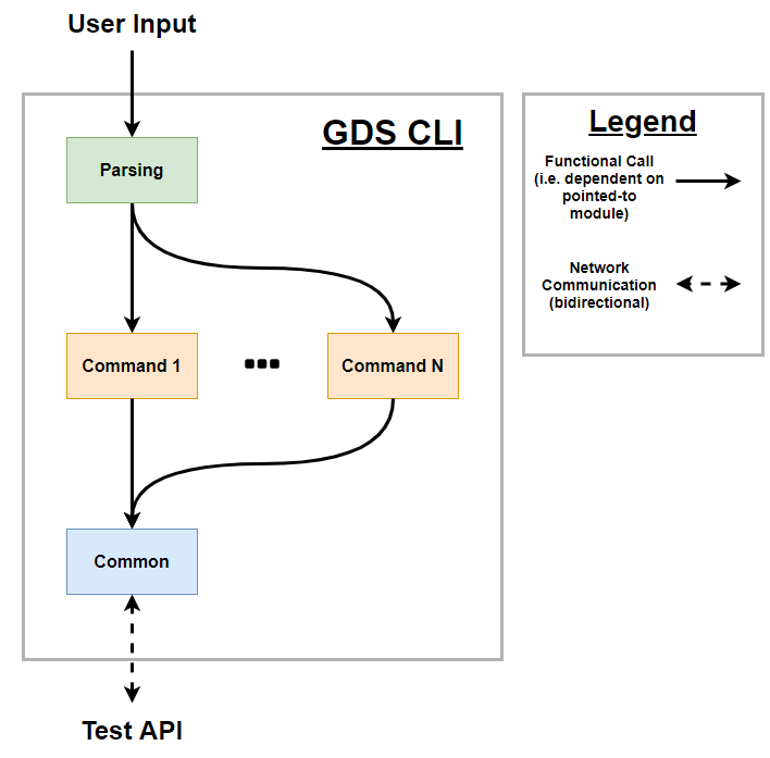 The CLI will interact with the GDS through an appropriate API, which the CLI modules access through an interface in Common. While the REST API was initially targeted, we later decided to transition to the Integration Test API for now due to its filtering capabilities.