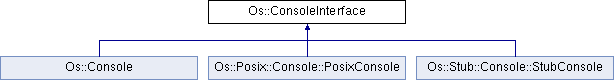 Implemented in Os::Console, Os::Posix::Console::PosixConsole, and Os::Stub::Console::StubConsole.